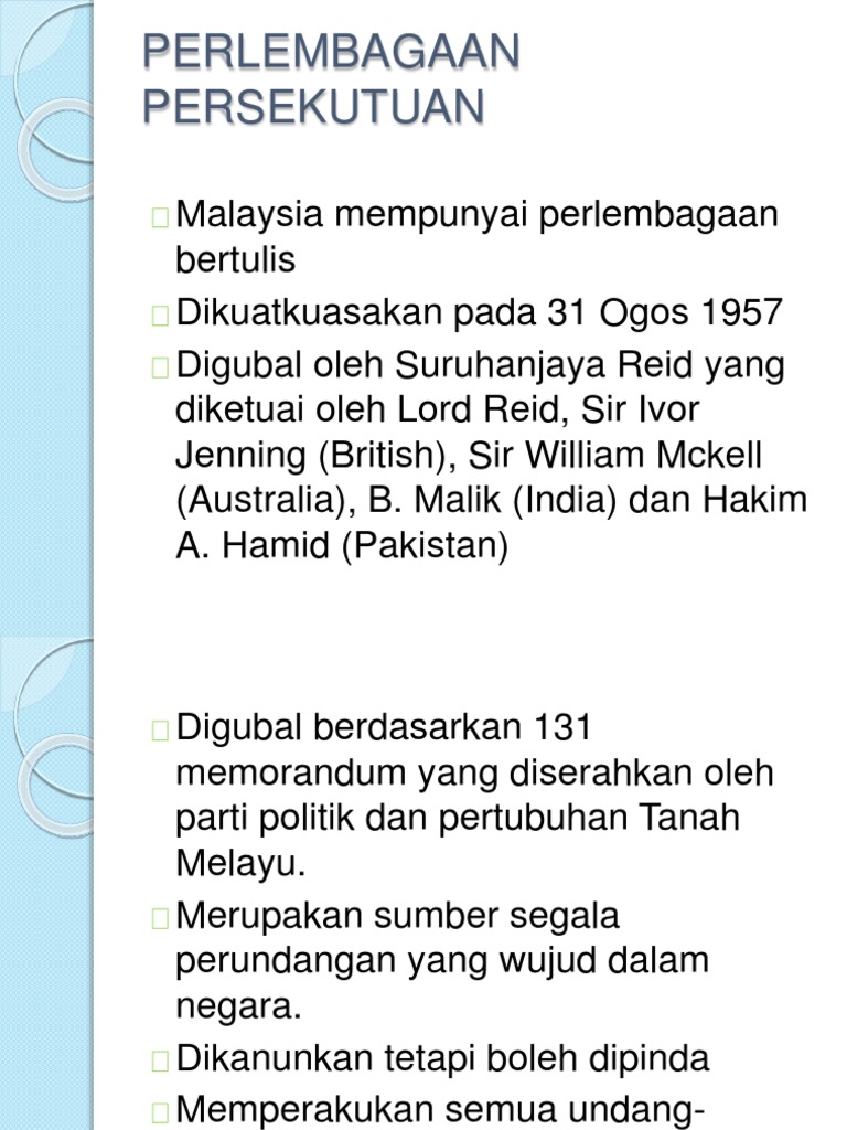 UNDANG-UNDANG MALAYSIA PERLEMBAGAAN PERSEKUTUAN Mengandungi pindaan terkini - Diperkenalkan pertama kali sebagai Perlembagaan Persekutuan Tanah Melayu pada Hari. Perkara 3 1 dalam perlembagaan menyatakan bahawa Islam ialah agama bagi Persekutuan. Baca versi flipbook dari.